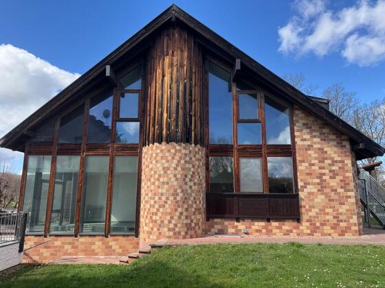 Der Eingang der Wohnung ist über eine Außenstahltreppe zu erreichen und liegt auf der Nordostseite des Gebäudes.