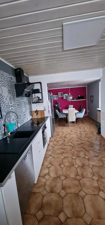 Im Erdgeschoss befindet sich die große Küche und das Wohnzimmer. Dazu ein Bad mit Badewanne und ein Abstellraum.