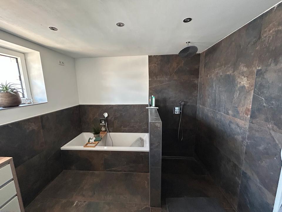 Schöne Erdgeschosswohnung mit 3 Schlafräume/Büro, Küche mit Einbauküche, großzügiger offener Wohn-/Eßbereich mit Ofen, 2 Bäder beide mit Dusche und Wanne. Terrasse, großer Garten mit Gartenhaus und Freisitz, Garage und Kellerräumen... mehr erfahren
