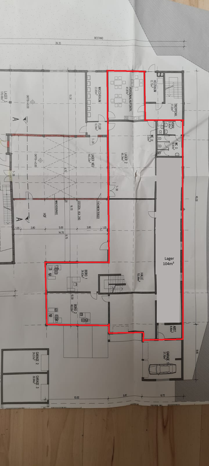 Zur Vermietung steht eine funktional aufgeteilte Gewerbeeinheit, bestehend aus mehreren Lagerflächen, Büroräumen, einem Personalraum sowie Sanitäranlagen, wie im Grundriss rot markiert dargestellt.