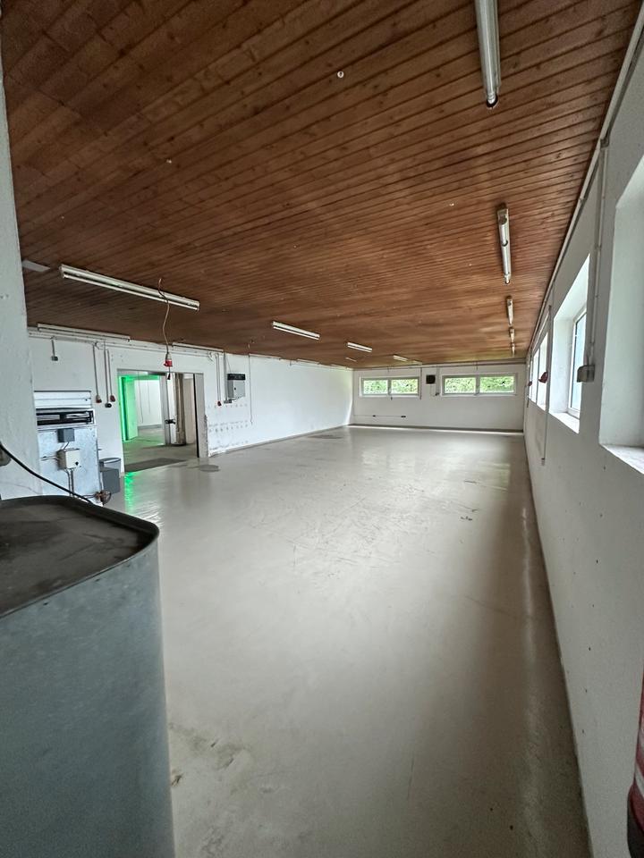 die Halle ist ca 350m2 groß und beheizbar mit einer Ölheizung und alternativ kann man auch einen Kaminofen reinstellen.