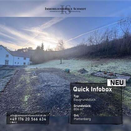Das Grundstück umfasst eine Fläche von ca. 806 Quadratmetern (Gem. Plettenberg Flur 15 Flurstuck 165) und ist aktuell mit einem Carport bebaut. Eine befestigte Zuwegung wurde durch den Eigentümer bereits... mehr erfahren