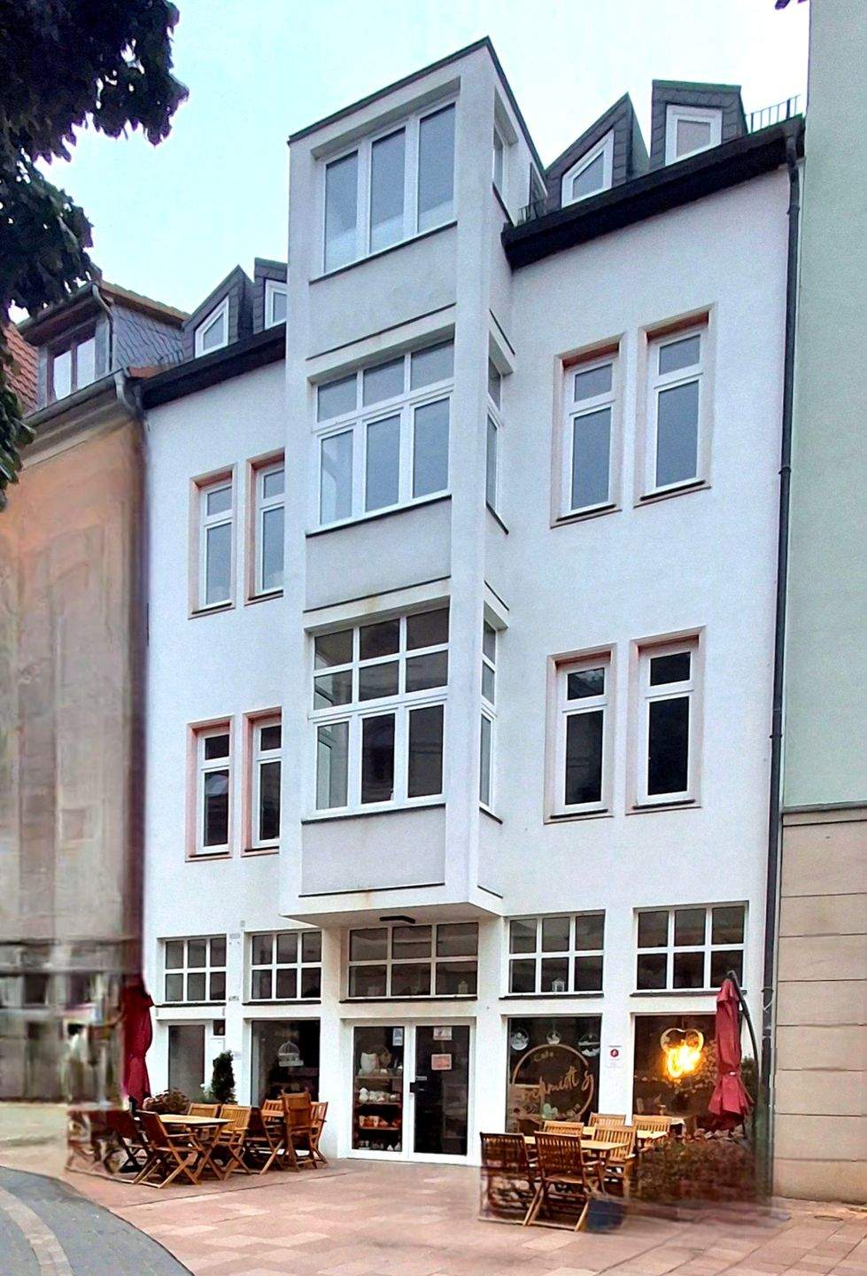einen Laden, Büroräume über 2 Etagen mit Innentreppe, Eigentümerwohnung und Appartementwohnung im Dachgeschoss (Vermietung über Booking)