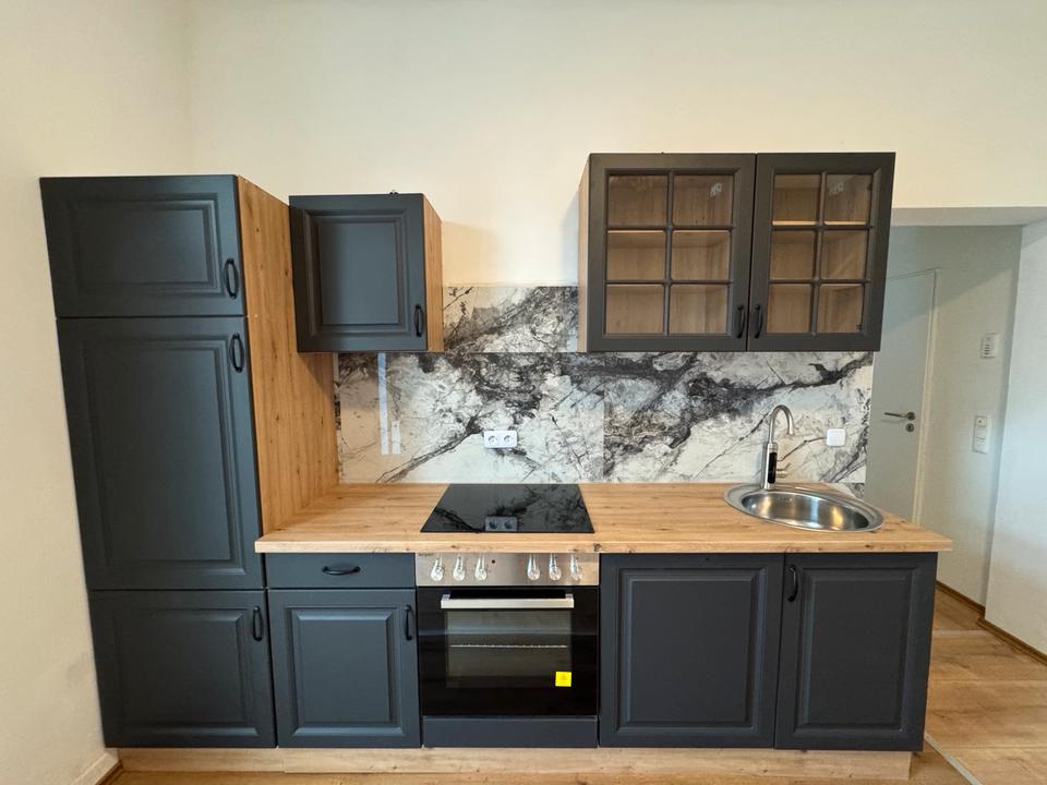 Kernsanirte 4,5 Zimmer Wohnung mit Gäste wc splitlevel Wohnung mit eigenem Treppenhaus mit neu eingebaute moderner hochwertiger Küche in elegantem Dunkelblau mit warmer Holzarbeitsplatte.