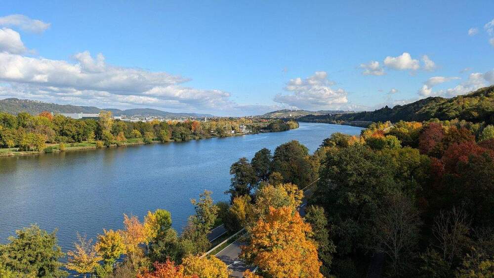 Aussicht mit Urlaubsfeeling: Unverbauter Blick auf die Mosel, Schloss Monaise und den gegenüberliegenden Reiterhof.