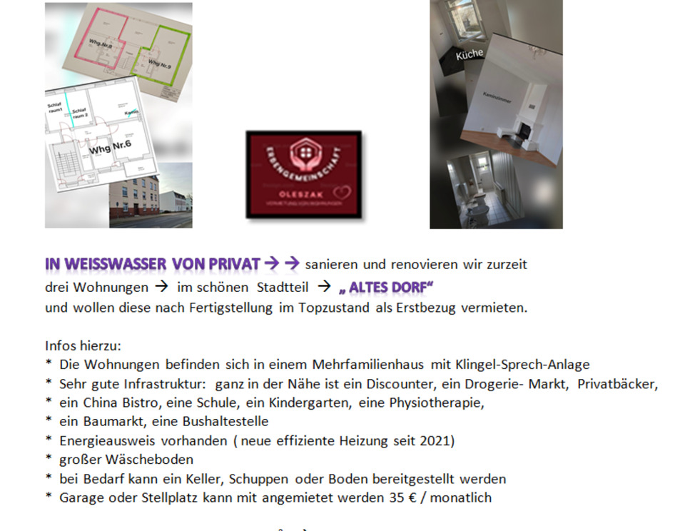 Wir renovieren für Sie und nach Fertigstellung, vermieten wir: eine 1Raumwhg sofort 46,qm für 455 € warm