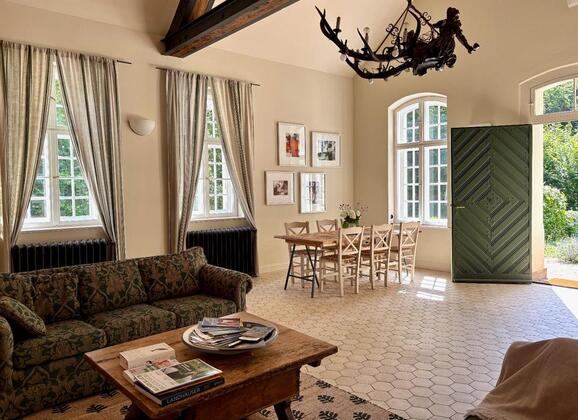 Wohnen Auf Zeit: Das Herzstück der Wohnung bildet ein 6 Meter hoher, 60m2 großer, loftartiger Raum, mit großen Fenstern, die auf alle Seiten einen schönen Blick in den Garten erlauben.... mehr erfahren