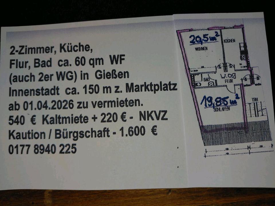 2 Zimmer, Küche, Flur, Bad ca. 60 m2 Wohnfläche in der Innenstadt von Gießen zu vermieten.