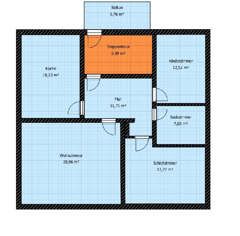ca. 95 qm. Verteilt auf drei Zimmer, Küche, Bad, Flur und Balkon.