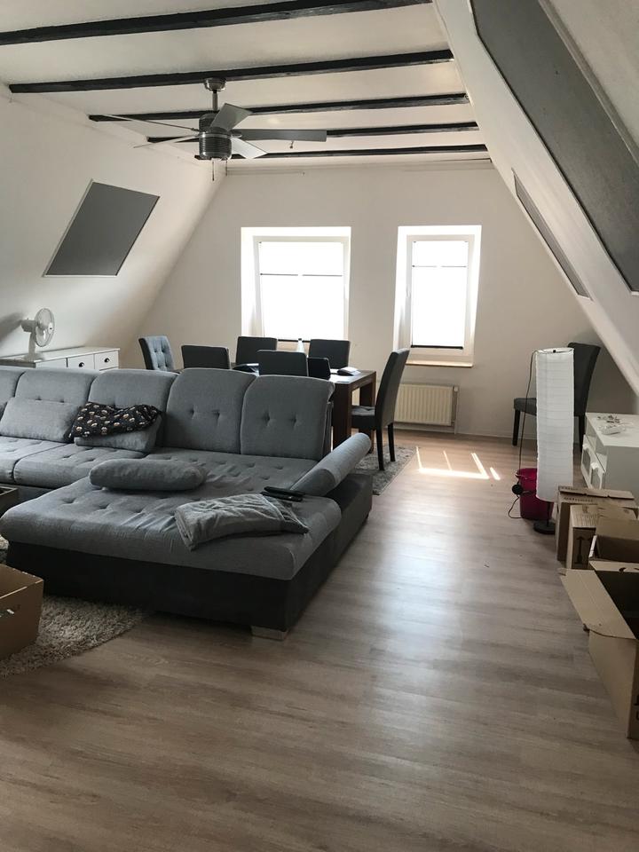 4 Zimmer mit großem Wohnzimmer, Abstellraum, Terrasse zur Südseite, Schuppen, zwei Stellplätze Dachboden ab dem 1.5.26 frei drei Monate Kaution