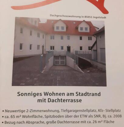 angeboten wird eine 2 Zimmer Dachgeschosswohnung im schönen Süden Ingolstadt/Unterbrunnenreuth. Der Dachboden wurde komplett ausgebaut und dient als Büro oder als Gästezimmer. Zur Wohnung selbst gehört 1 Tiefgaragen... mehr erfahren