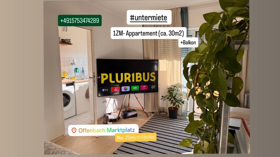 Hallo, ich untermiete mein schönes & sonniges 1Z-Appartement in Offenbach-Marktplatz von März 2026 bis Mitte Mai 2026, da ich berufsbedingt ab März 2026 bis Mitte Mai 2026 im Ausland bin.